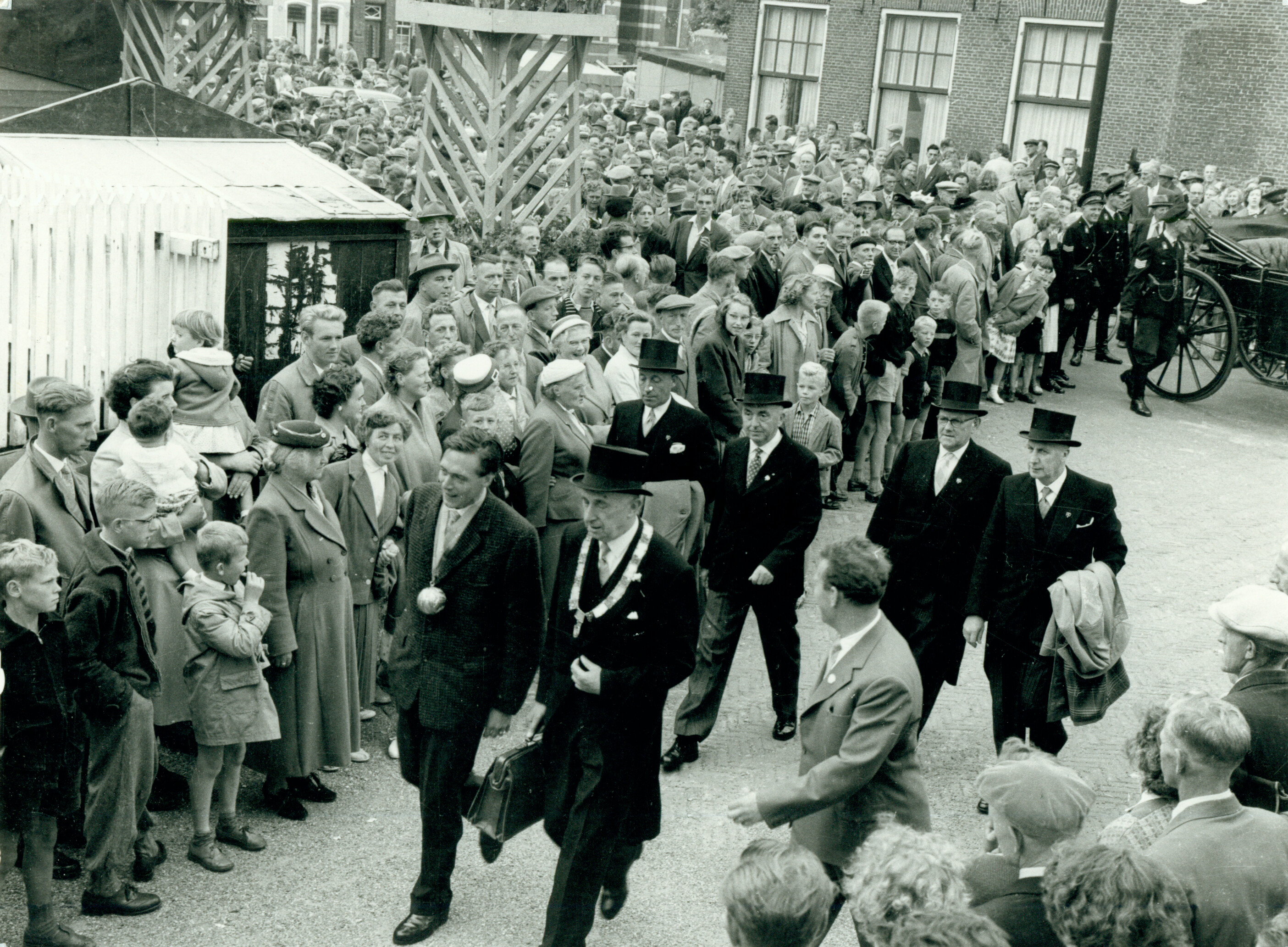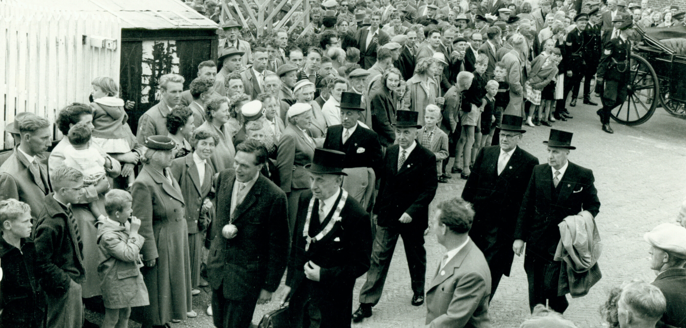 Foto onder: In 1958 betreedt de koning van 1957 het veld samen met voorzitter Klaas Bijlsma